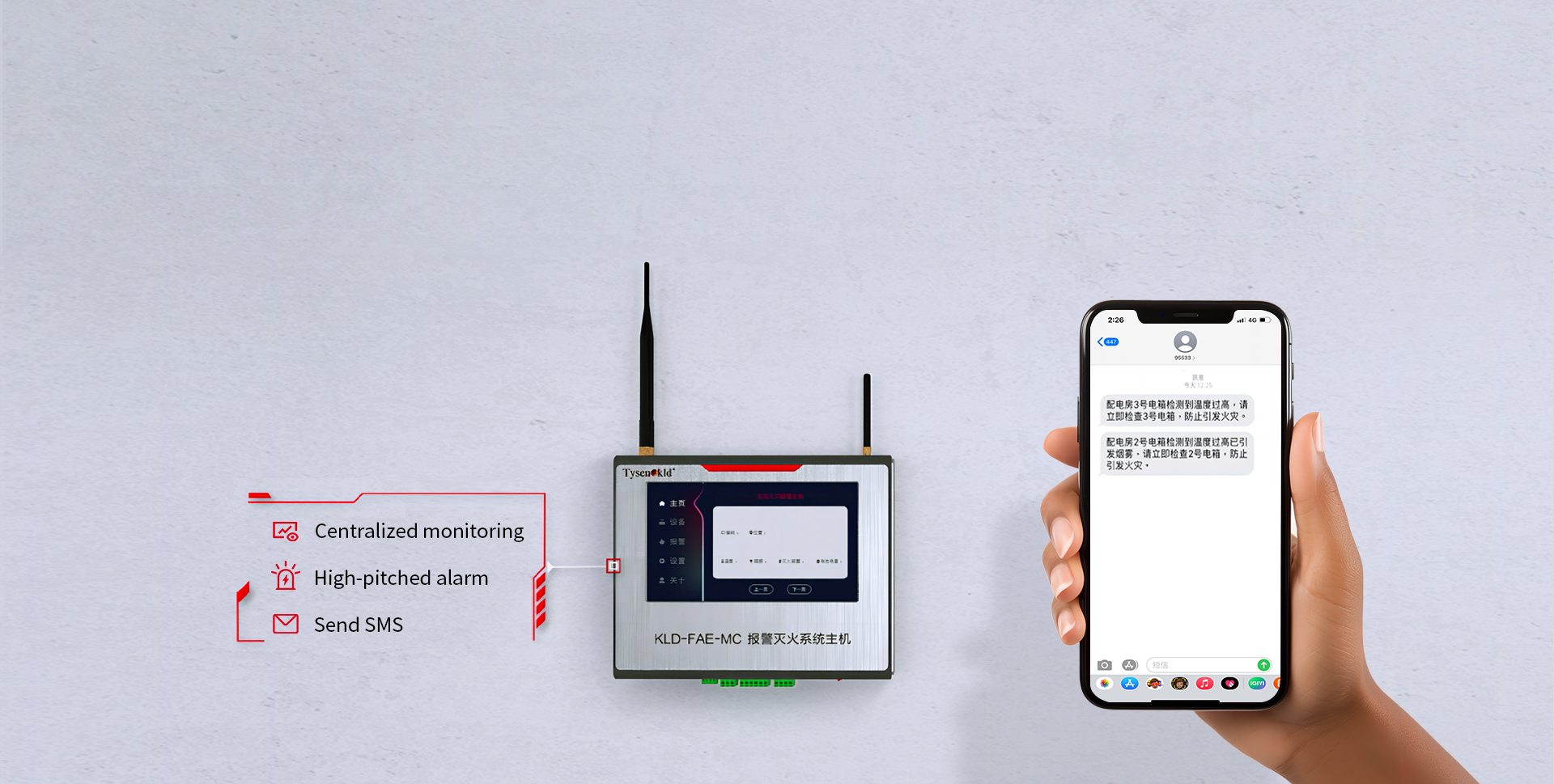 KLD-FAE series automatic electrical fire-extinguishing system is mainly composed of three main devices: automatic alarm and fire-extinguishing system host, automatic alarm and fire-extinguishing controller and automatic fire-extinguishing device. The host receives the online monitoring data from the automatic alarm and fire-extinguishing controller and displays the temperature and smoke detection status in real time through wireless transmission. When an electrical fire occurs, the controller can quickly control the automatic fire-extinguishing device to extinguish the fire.